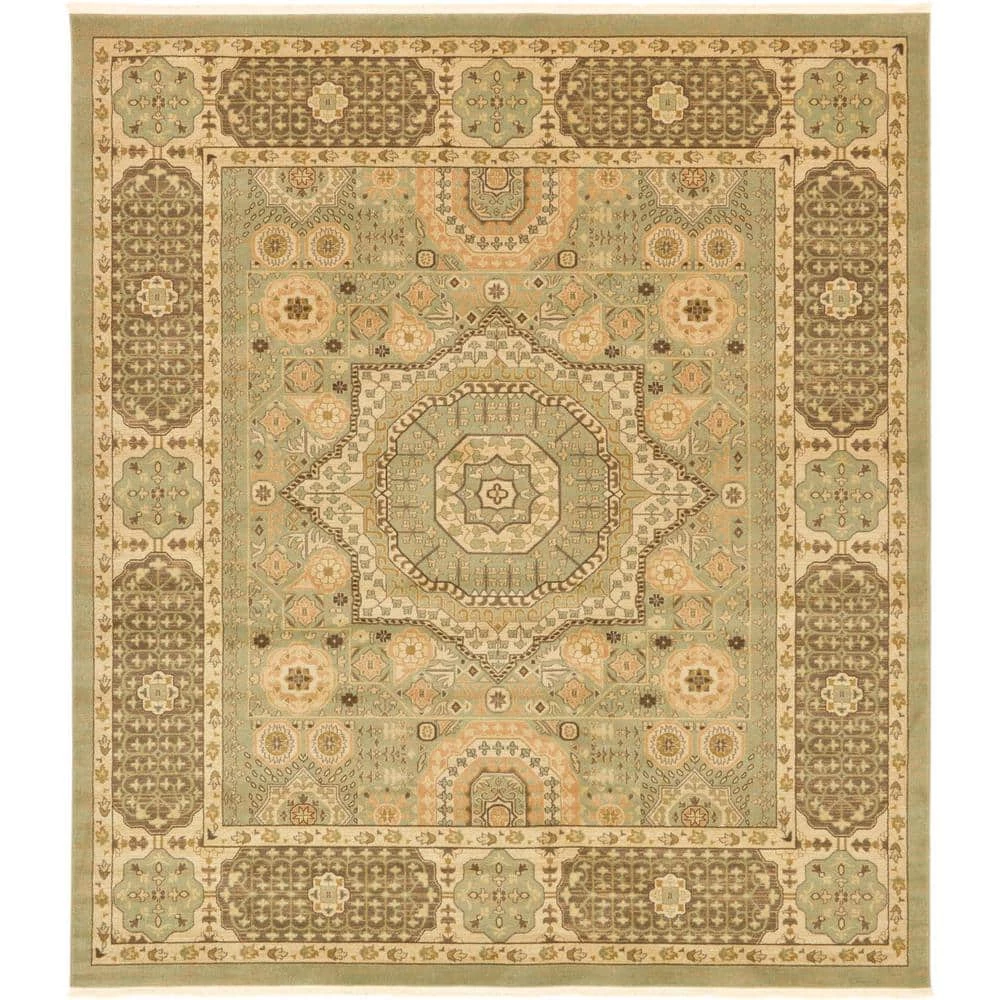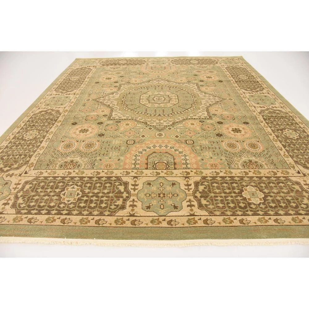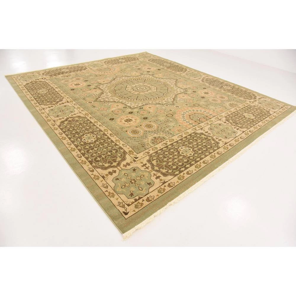 This Unique Loom Palace Collection 10 ft. x 11 ft. Area Rug will be a decorative addition to your home. This rectangular rug features a transitional style, which works well with any decor. It has a stain-resistant design and fade-resistant materials, which ensure that its colors will not fade. It comes in a green shade, incorporating a cheerful and colorful vibe into any room. Made with polypropylene, it will be an extremely durable choice for your living space. This rug has an oriental motif for a designed piece that never goes out of style.